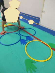 やっていく中で手足の動きがごちゃごちゃになりやすいため、今回はフープや手形などの視覚支援をつかってテストを行いました!