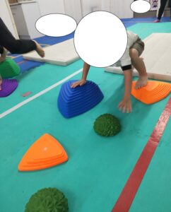 マットでジャガイモ、クマのブロック渡り、平均台ワニ、平均台渡りを組み合わせた種目です!
