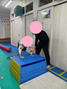 ②の跳び箱でカエルのあしうちでは跳び箱に手をつき、足で拍手を行う種目です。