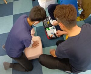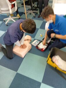 今回は各教室の代表者が集まり、救急救命活動の流れを確認し、人形を使った心臓マッサージやAEDによるの心肺蘇生法を訓練しました。
