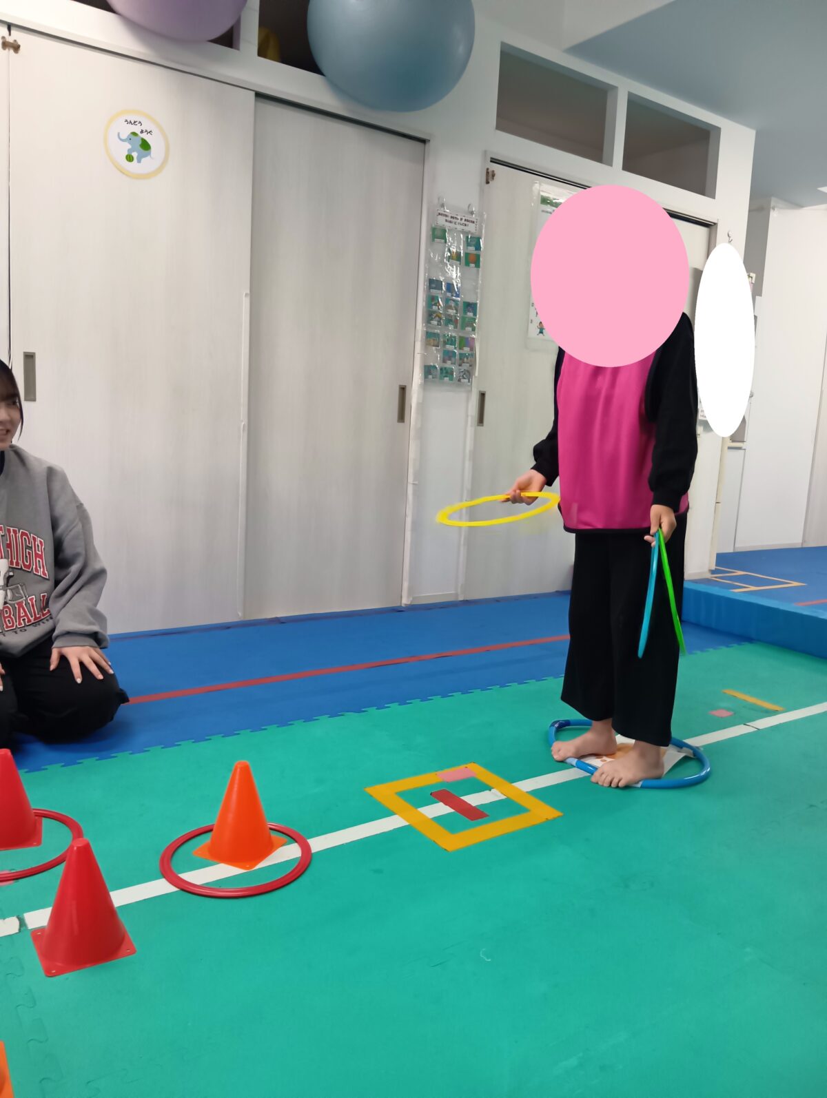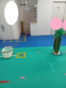 わなげやスリッパとばし、フープとりゲーム、風船ラリーを行いました!